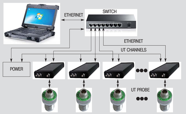Due to the flaw detector is designed in a form of a standalone device with the connection to the PC via Ethernet port, the several UT channels can be connected to the PC via Switch unit. This allows to create UT multi-channel testing systems.